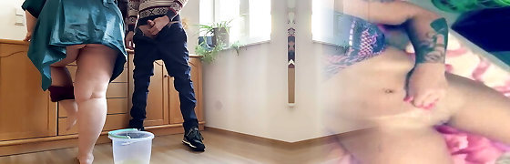 Dear mother-in-law takes off her panties and pisses with her legs wide open in a bucket next to her son-in-law-in-law