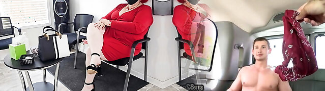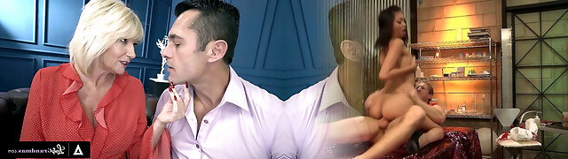 Hot Step Mother Seduces Step Son in the office, shows him milky nipples and Makes ample cock Handjob