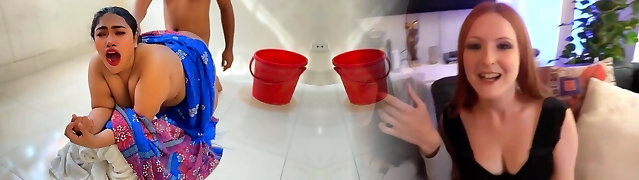 While the Desi step-mother washes bra & panties, stepmom took off the stepson's pants and Nude him, Then asks him to boink her - Cum