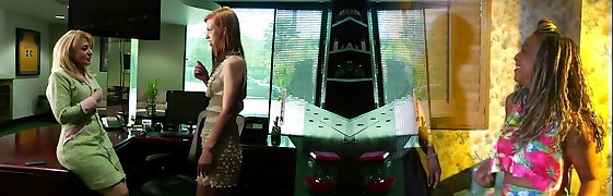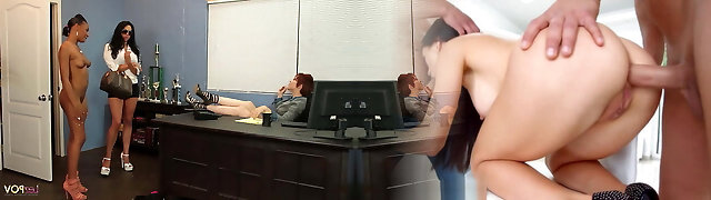 Red hair boss g/g is disciplining a bad lesbo employee in a super hot interracial office sex action