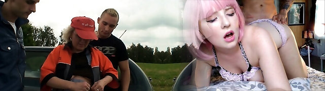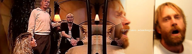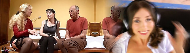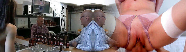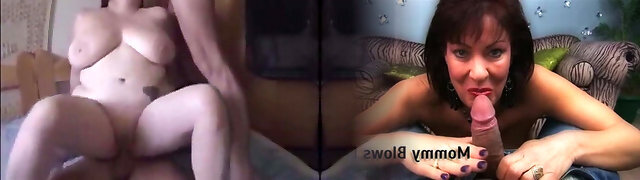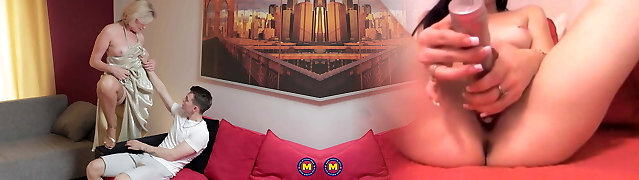 German blonde grannie filmed in pov deep-throating and fucking two cocks of two eager friends penetrating her wet labia