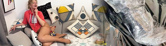 Mother-in-law lifts up her new sundress and shows her legs and ass in pantyhose