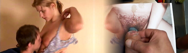 Horny platinum-blonde German lady gets warm jizz on her shaved pussy