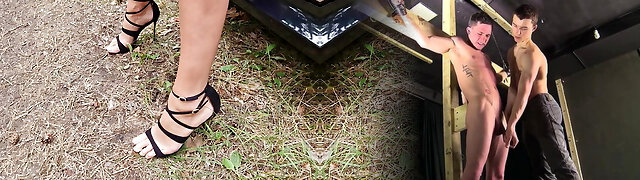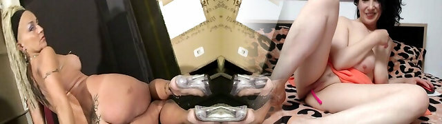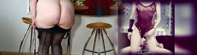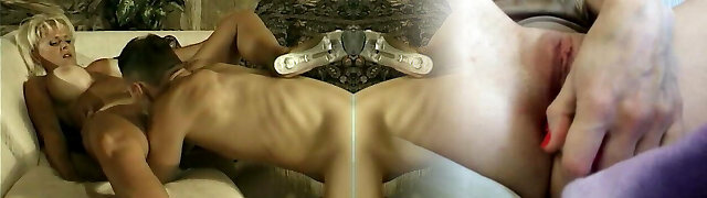 成熟的女人在短裙和高跟鞋的传播她的阴部,并显示奶